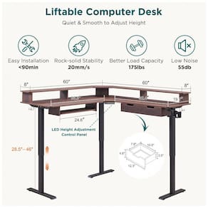 A Mesa em L Elétrica RedLemon de 60 polegadas (152 cm) em acabamento nogueira escura oferece ajuste de altura motorizado de 72 cm a 117 cm, com 4 memórias pré-programadas para controle preciso via painel touch. Estrutura em metal com tampo de madeira engenheirada de 3,8 cm de espessura suporta configurações duplas de monitores, incluindo prateleira dedicada com altura de 38 cm e gavetas laterais tipo caixa para organização de periféricos. Integra tomadas elétricas com portas USB, ganchos laterais, suporte giratório 360° para copo e bandeja retrátil para teclado, otimizando espaço em setups gamer ou home office.