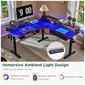 Luzes LED RGB com 12 modos de cena permitem ciclos de cores personalizáveis para ambientes de jogos ou trabalho, controladas independentemente. Design em formato L de 152 cm x 152 cm com diagonal de superfície de 216 cm divide área em zonas de escritório e entretenimento, com mecanismo de elevação elétrica e montagem autônoma no piso. Acabamento em decalque walnut sobre base branca, compatível com adultos e uso intensivo em salas, escritórios ou estudos.