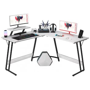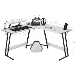 A diagonal de superfície de trabalho alcança 136 cm, suportando operação simultânea de dispositivos gamer. Acabamento brilhante em branco clássico cobre tampo e base, compatível com limpeza por pano seco em ambientes residenciais. Montagem requerida para uso em escritórios ou salas de jogos.