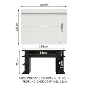 Itens inclusos: - Uma (1) Mesa Gamer com 75 cm de altura, 136 cm de largura e 60 cm de profundidade - Um (1) Painel com 123 cm de altura, 160 cm de largura e 15 cm de profundidade