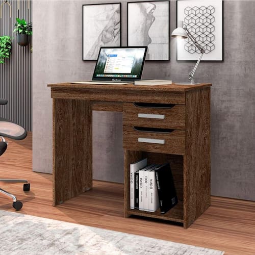 O tampo espaçoso acomoda , livros, documentos e materiais de escritório com conforto. As duas gavetas proporcionam praticidade no dia a dia, mantendo seus itens mais importantes sempre à mão e bem guardados. Seu design limpo e elegante permite combinações com diversos estilos de decoração.