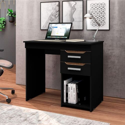 O tampo espaçoso acomoda , livros, documentos e materiais de escritório com conforto. As duas gavetas proporcionam praticidade no dia a dia, mantendo seus itens mais importantes sempre à mão e bem guardados. Seu design limpo e elegante permite combinações com diversos estilos de decoração.