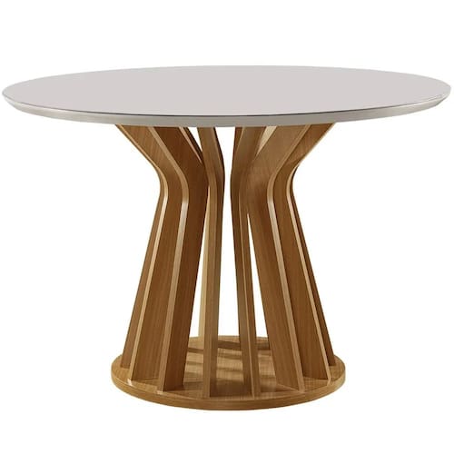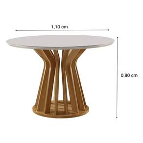 Mesa Ilheus Redonda 110x110 LJ Móveis A Mesa Ilheus Redonda 110x110 LJ Móveis é a peça perfeita para quem busca combinar elegância e funcionalidade. Com um tampo de vidro redondo, ela proporciona uma sensação de amplitude e leveza ao ambiente, além de ser fácil de limpar e resistente. O grande destaque, no entanto, é a sua base ripada. Com um design moderno e sofisticado, a base de madeira com detalhes verticais ondulados cria um visual único e contemporâneo, que adiciona textura e personalidade à sua sala de jantar. A união do vidro com a base ripada resulta em um móvel que se adapta tanto a decorações minimalistas quanto a ambientes mais ousados.\nMEDIDAS\nAltura 80 cm\nComprimento 100 cm\nLargura 100 cm\nCARACTERÍSTICAS\nFabricante LJ Móveis\nModelo Mesa Ilheus\nGarantia 3 meses\nTipo de Produto Mesa de Jantar\nAmbiente Sala de Jantar\nEstrutura MDF\nEstilo Moderno\nPossui Vidro Sim\nEspessura Vidro 4mm\nAcabamento Pintura PU\nNecessita Montagem Sim\nAcompanha Manual de Instalação Sim\nINFORMAÇÕES IMPORTANTES\nObjetos decorativos que porventura apareçam na foto, não acompanham o produto. Não nos responsabilizamos pela montagem/instalação dos produtos.\nMontagens, desmontagens e instalações são responsabilidades do cliente. Indicamos que contrate uma empresa de montagem ou um montador de sua confiança.\nAlém disso, favor verificar se os pés e acessórios estão dentro do forro inferior do produto. Em suma, todas as informações divulgadas sobre o produto são de responsabilidade do Fabricante.\nAs cores do produto podem variar de acordo com o seu monitor, a iluminação do ambiente em que você está e até mesmo a sua percepção visual. Além da cor, pequenos detalhes e acabamentos podem não ficar evidentes na foto, por isso as imagens são meramente ilustrativas.