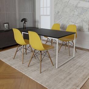 Mesa Industrial Base Ferro Branco Tampo 137x90 Preto 4 Cadeiras Eames Madeira Assento AmareloA mesa de jantar é um dos poucos móveis que efetivamente reúne a família para saborear um bom prato ao lado das pessoas que mais ama. E para garantir que o seu ambiente fique impecável, conte com a Mesa De Jantar Industrial e as Cadeiras Eames. Os modelos buscam inspiração no estilo industrial, mas, ao mesmo tempo, abre um leque de possibilidades na hora de colocar a criatividade em prática e fazer as melhores harmonizações para a sua sala de jantar ou cozinha. Distribuindo sofisticação ao cômodo, você ainda pode combiná-la com as outras peças da Linha Industrial para conquistar um visual completo.Tipo: Mesa de Jantar Retangular com 4 CadeirasModelo: Mesa Industrial e Cadeiras EamesInformações MesaCor Base: BrancoCor Tampo: PretoAltura: 78cmLargura: 137cmComprimento: 90cmInformações Cadeira:Pés: MadeiraCor Assento: AmareloAltura: 85cmLargura: 47cmComprimento: 50cmATENÇÃOIMAGENS MERAMENTE ILUSTRATIVAS REALIZADO EDIÇÃO, PODENDO HAVER UMA PEQUENA VARIAÇÃO DE COR DEPENDENDO DE CADA TELA OU MONITOR.Mesa Industrial Base Ferro Branco Tampo 137x90 Preto 4 Cadeiras Eames Madeira Assento Amarelo