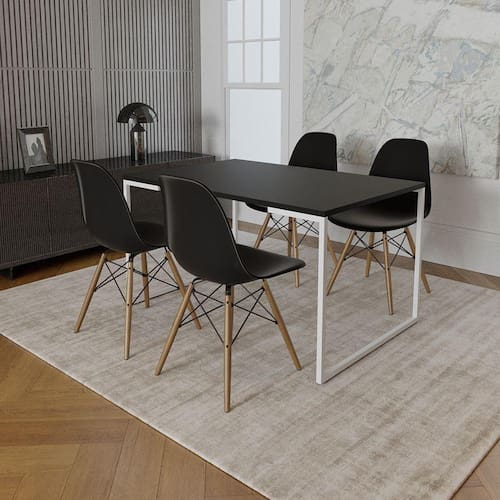 Mesa Industrial Base Ferro Branco Tampo 137x90 Preto 4 Cadeiras Eames Madeira Assento PretoA mesa de jantar é um dos poucos móveis que efetivamente reúne a família para saborear um bom prato ao lado das pessoas que mais ama. E para garantir que o seu ambiente fique impecável, conte com a Mesa De Jantar Industrial e as Cadeiras Eames. Os modelos buscam inspiração no estilo industrial, mas, ao mesmo tempo, abre um leque de possibilidades na hora de colocar a criatividade em prática e fazer as melhores harmonizações para a sua sala de jantar ou cozinha. Distribuindo sofisticação ao cômodo, você ainda pode combiná-la com as outras peças da Linha Industrial para conquistar um visual completo.Tipo: Mesa de Jantar Retangular com 4 CadeirasModelo: Mesa Industrial e Cadeiras EamesInformações MesaCor Base: BrancoCor Tampo: PretoAltura: 78cmLargura: 137cmComprimento: 90cmInformações Cadeira:Pés: Madeira Cor Assento: PretoAltura: 85cmLargura: 47cmComprimento: 50cmATENÇÃOIMAGENS MERAMENTE ILUSTRATIVAS REALIZADO EDIÇÃO, PODENDO HAVER UMA PEQUENA VARIAÇÃO DE COR DEPENDENDO DE CADA TELA OU MONITOR.Mesa Industrial Base Ferro Branco Tampo 137x90 Preto 4 Cadeiras Eames Madeira Assento Preto