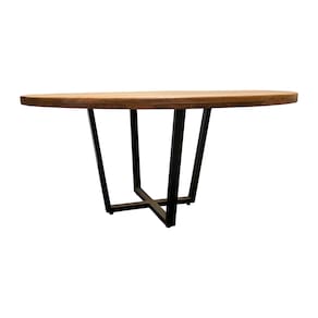 Mesa Industrial Redonda 1,50 Elaine Em Madeira Maciça E Base Em Ferro Preto A Mesa industrial Elaine possui um visual cheio de estilo, perfeito para compor o seu ambiente e acomodar a todos. A mesa possui tampo em madeira maciça repleto de resistência e beleza.