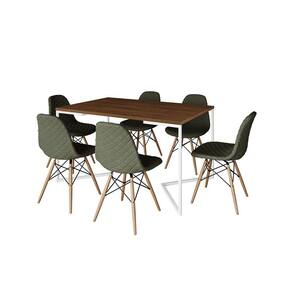 Mesa Industrial Retangular Amêndoa Base V Aço Branco 137x90cm 6 Cadeiras Madeira Estofadas Verdes - Marrom