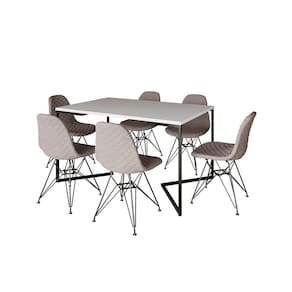 Mesa Industrial Retangular Base V 137x90cm Branca C/ 6 Cadeiras Estofadas Nude Médio Eiffel Aço Pret - Branco