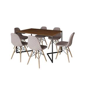 Mesa Industrial Retangular Base V Aço Preto 137x90cm Amêndoa 6 Cadeiras Madeira Estofadas Nude Médio - Marrom
