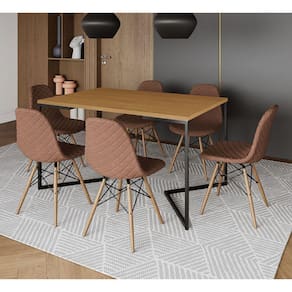 Mesa Industrial Retangular Base V Aço Preto 137x90cm Canela 6 Cadeiras Madeira Estofadas Caramelo - Marrom