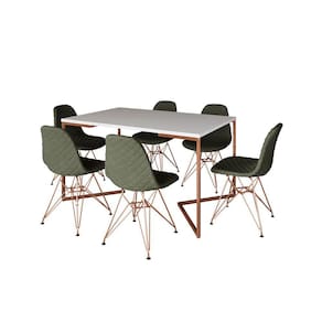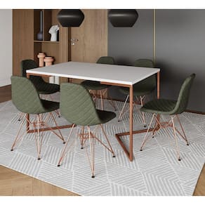 Mesa Industrial Retangular Branca Base V Cobre 137x90cm 6 Cadeiras Estofadas Verdes Eiffel Cobre - Branco