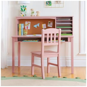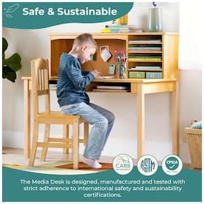 Conjunto infantil composto por mesa, cadeira e estante superior (hutch) da marca Guidecraft, projetado para crianças em idade escolar (5 a 12 anos). A mesa possui estrutura robusta em madeira maciça e madeira compensada, com superfície envernizada para maior durabilidade e fácil limpeza. A estante superior oferece um painel de cortiça para fixação de avisos ou objetos leves, além de 5 nichos acessíveis para armazenamento organizado de material escolar. Conta também com recortes para passagem e ocultação de fios, facilitando a organização de dispositivos eletrônicos.
