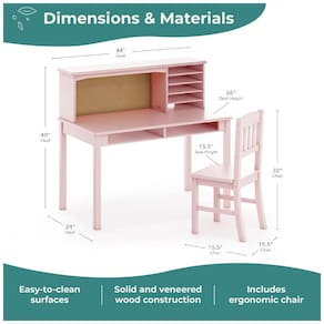 Dimensões totais do conjunto: 112 cm de comprimento x 61 cm de profundidade x 102 cm de altura. Altura da superfície da mesa: 66 cm. Cadeira com assento de 39 cm de altura, medida ideal para conforto e ergonomia em crianças. O design moderno e funcional contempla acabamento em cor rosa, adequado para ambientes infantis.
