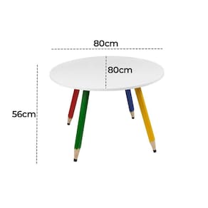 Mesa Infantil Lápis Coloridos Redonda Tampo Branco Pés Temáticos Quarto Menina Menino Mobília Decor Mesinha Redonda Infantil Pé Lápis Mesa redonda para quartos infantis, brinquedotecas e escolinhas, com tampo 80x80 cm e pés em formato de lápis coloridos (amarelo, verde, vermelho e azul), unindo diversão e praticidade no dia a dia.? Medidas e capacidade: 56 cm de altura; 80 x 80 cm; peso 6,2 kg; suporta até 10 kg distribuídos.?