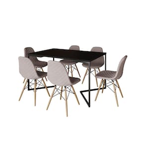 Mesa Jantar Industrial Preta 137x90cm Base V Aço Preto C/ 6 Cadeiras Madeira Estofadas Nude Médio