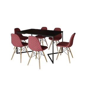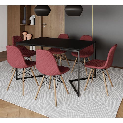 A mesa de jantar é um dos poucos móveis que efetivamente reúne a família para saborear um bom prato ao lado das pessoas que mais ama. E para garantir que o seu ambiente fique impecável, conte com a Mesa De Jantar Industrial. As laterais vazadas, sua forma reta e sua base em V conferem sofisticação e ótimo aproveitamento no cômodo.Tipo: ConjuntoModelo: Industrial Base VCor Tampo Mesa: PretoCor Base Mesa: PretoCor Assento Cadeira: VermelhoBase Cadeira: MadeiraMedidas da Mesa:Altura: 78cmComprimento: 90cmLargura: 137cmMedidas da Cadeira:Altura: 85cmLargura: 47cmComprimento: 37cmATENÇÃOIMAGENS MERAMENTE ILUSTRATIVAS REALIZADO EDIÇÃO, PODENDO HAVER UMA PEQUENA VARIAÇÃO DE COR DEPENDENDO DE CADA TELA OU MONITOR.