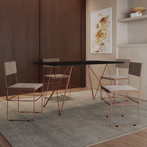 O Conjunto Vitória tem um design industrial que remete a leveza e sofisticação a sua sala de jantar ou escritório. Além disso, é uma ótima opção pra quem procura um produto moderno e bonito, com um ótimo acabamento. Ideal pra quem busca criar um ambiente moderno.Tipo: ConjuntoModelo: VitóriaTecido: VeludoCor Tampo da Mesa: PretoCor da Base da Mesa: PretoCor do assento da Cadeira: BegeCor da Base da Cadeira: CobreMedidas Cadeira:Altura: 88cmLargura: 42cmComprimento: 42cmMedidas Mesa:Altura: 76cmLargura: 80cmComprimento: 140cmATENÇÃOIMAGENS MERAMENTE ILUSTRATIVAS REALIZADO EDIÇÃO, PODENDO HAVER UMA PEQUENA VARIAÇÃO DE COR DEPENDENDO DE CADA TELA OU MONITOR.Mesa Jantar Industrial Trama 1,40x0,80m Preta com 4 Cadeiras Estofadas VitÃria Bege e Cobre