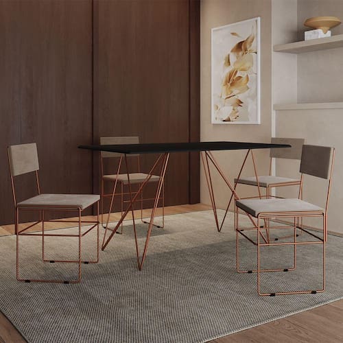 Mesa Jantar Industrial Trama 1,40x0,80m Preta Com 4 Cadeiras Estofadas Vitória Bege E Cobre