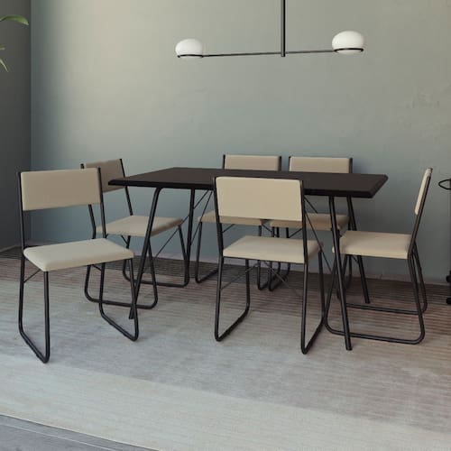 Mesa Jantar Paraty 150cm Tampo Preto com Cadeiras 6 Cadeiras Angra Estofadas Preta e Bege