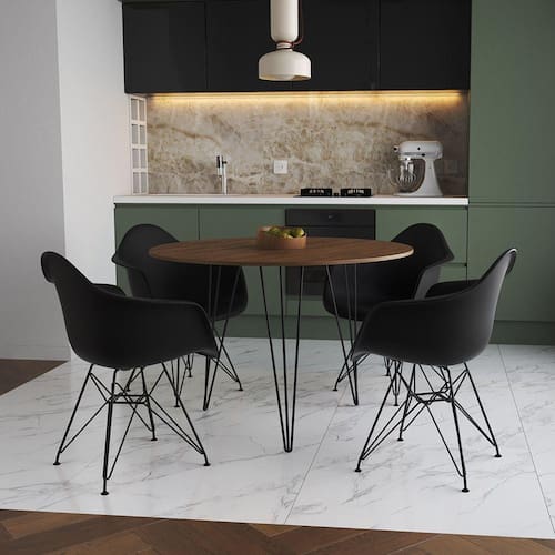 A Mesa de Jantar Redonda Clips com as Poltronas Eiffel é a escolha perfeita para você que está em busca de um produto sofisticado e muito versátil! O Conjunto possui o diferencial de ser um produto compacto e prático, podendo ser incorporado facilmente nos mais diversos ambientes, como: cozinhas, restaurantes, varandas ou até áreas de festas!CaracterísticasTipo: Conjunto Mesa e 4 PoltronasModelo: ClipsCor do Tampo: AmêndoaCor do Assento: PretoBase Ferro: PretoDIMENSÕES DO PRODUTOPoltrona:Altura: 80cmLargura: 38cmComprimento: 38cmMesa:Altura: 85cmDiâmetro: 110cmATENÇÃOAS IMAGENS SÃO MERAMENTE ILUSTRATIVAS E PODEM SOFRER VARIAÇÕES DE COR E PEQUENOS DETALHES DE ACORDO COM O SEU MONITOR, ILUMINAÇÃO DO AMBIENTE E ATÉ MESMO A SUA PERCEPÇÃO VISUAL.Mesa Jantar Redonda 110cm AmÃndoa Clips 3 PÃs com 4 Poltronas Pretas Eames Eiffel Ferro Preto