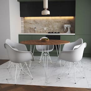 A Mesa de Jantar Redonda Clips com as Poltronas Eiffel é a escolha perfeita para você que está em busca de um produto sofisticado e muito versátil! O Conjunto possui o diferencial de ser um produto compacto e prático, podendo ser incorporado facilmente nos mais diversos ambientes, como: cozinhas, restaurantes, varandas ou até áreas de festas!CaracterísticasTipo: Conjunto Mesa e 5 PoltronasModelo: ClipsCor do Tampo: AmêndoaCor do Assento: BrancoBase Ferro: BrancoDIMENSÕES DO PRODUTOPoltrona:Altura: 80cmLargura: 38cmComprimento: 38cmMesa:Altura: 85cmDiâmetro: 110cmATENÇÃOAS IMAGENS SÃO MERAMENTE ILUSTRATIVAS E PODEM SOFRER VARIAÇÕES DE COR E PEQUENOS DETALHES DE ACORDO COM O SEU MONITOR, ILUMINAÇÃO DO AMBIENTE E ATÉ MESMO A SUA PERCEPÇÃO VISUAL.Mesa Jantar Redonda 110cm AmÃndoa Clips 3 PÃs com 5 Poltronas Eames Eiffel Brancas Ferro Branco