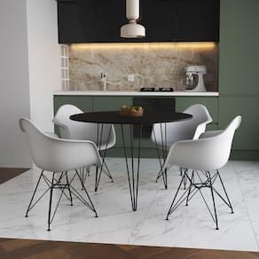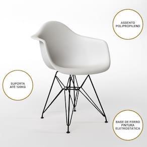 A Mesa de Jantar Redonda Clips com as Poltronas Eiffel é a escolha perfeita para você que está em busca de um produto sofisticado e muito versátil! O Conjunto possui o diferencial de ser um produto compacto e prático, podendo ser incorporado facilmente nos mais diversos ambientes, como: cozinhas, restaurantes, varandas ou até áreas de festas!CaracterísticasTipo: Conjunto Mesa e 4 PoltronasModelo: ClipsCor do Tampo: PretoCor do Assento: BrancoBase Ferro: PretoDIMENSÕES DO PRODUTOPoltrona:Altura: 80cmLargura: 38cmComprimento: 38cmMesa:Altura: 85cmDiâmetro: 110cmATENÇÃOAS IMAGENS SÃO MERAMENTE ILUSTRATIVAS E PODEM SOFRER VARIAÇÕES DE COR E PEQUENOS DETALHES DE ACORDO COM O SEU MONITOR, ILUMINAÇÃO DO AMBIENTE E ATÉ MESMO A SUA PERCEPÇÃO VISUAL.Mesa Jantar Redonda 110cm Preta Clips 3 PÃs com 4 Poltronas Brancas Eames Eiffel Ferro Preto