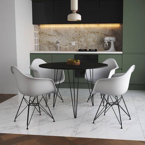 Mesa Jantar Redonda 110Cm Preta Clips 3 Pés Com 4 Poltronas Brancas Ferro Preto - Cor: Preto