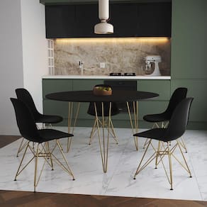 Mesa Jantar Redonda 110Cm Preta Clips 3 Pés Com 5 Cadeiras Pretas Base Dourada - Cor: Preto