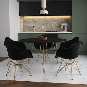 A Mesa de Jantar Redonda Clips com as Poltronas Eiffel é a escolha perfeita para você que está em busca de um produto sofisticado e muito versátil! O Conjunto possui o diferencial de ser um produto compacto e prático, podendo ser incorporado facilmente nos mais diversos ambientes, como: cozinhas, restaurantes, varandas ou até áreas de festas!CaracterísticasTipo: Conjunto Mesa e 5 PoltronasModelo: ClipsCor do Tampo: PretoCor do Assento: PretoBase Ferro: DouradoDIMENSÕES DO PRODUTOPoltrona:Altura: 80cmLargura: 38cmComprimento: 38cmMesa:Altura: 85cmDiâmetro: 110cmATENÇÃOAS IMAGENS SÃO MERAMENTE ILUSTRATIVAS E PODEM SOFRER VARIAÇÕES DE COR E PEQUENOS DETALHES DE ACORDO COM O SEU MONITOR, ILUMINAÇÃO DO AMBIENTE E ATÉ MESMO A SUA PERCEPÇÃO VISUAL.Mesa Jantar Redonda 110cm Preta Clips 3 PÃs com 5 Poltronas Eames Eiffel Pretas Base Dourada