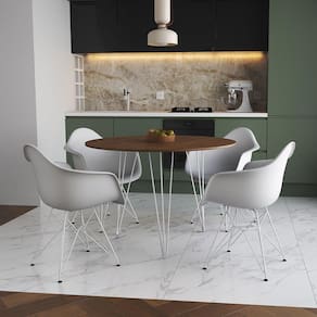 A Mesa de Jantar Redonda Clips com as Poltronas Eiffel é a escolha perfeita para você que está em busca de um produto sofisticado e muito versátil! O Conjunto possui o diferencial de ser um produto compacto e prático, podendo ser incorporado facilmente nos mais diversos ambientes, como: cozinhas, restaurantes, varandas ou até áreas de festas!CaracterísticasTipo: Conjunto Mesa e 4 PoltronasModelo: Clips Cor do Tampo: AmêndoaCor do Assento: BrancoBase Ferro: BrancoDIMENSÕES DO PRODUTOPoltrona:Altura: 80cmLargura: 38cmComprimento: 38cmMesa:Altura: 85cmDiâmetro: 90cmATENÇÃOAS IMAGENS SÃO MERAMENTE ILUSTRATIVAS E PODEM SOFRER VARIAÇÕES DE COR E PEQUENOS DETALHES DE ACORDO COM O SEU MONITOR, ILUMINAÇÃO DO AMBIENTE E ATÉ MESMO A SUA PERCEPÇÃO VISUAL.Mesa Jantar Redonda 90cm AmÃndoa Clips 3 PÃs com 4 Poltronas Eiffel Eames Daw Brancas Ferro Branco
