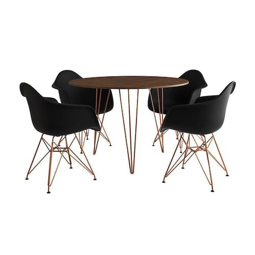Mesa Jantar Redonda 90Cm Amêndoa Clips 3 Pés Com 4 Poltronas Pretas Base Cobre - Cor: Amendoa - Preto