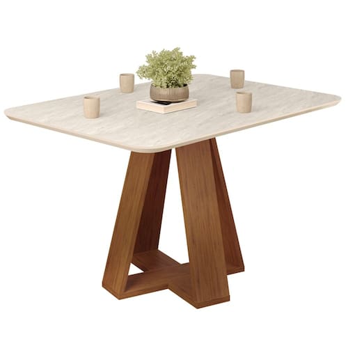 Ótima opção para trazer charme e funcionalidade para sua sala de jantar, perfeita para quem busca otimizar espaço. A mesa conta com estrutura em MDP/MDF que (suporta até 15 kg), formato retangular com espaço para 4 lugares, tampo em MDF 25mm (SEM VIDRO) com cantos arredondados, base em MDP 25mm com peças geométricas cruzadas, detalhes triangulares e sapatas deslizadoras. Acabamento em pintura UV texturizada fosca e brilho. Este móvel chegará em sua casa separado em 02 volume. Este móvel chegará em sua casa separado em 02 volume.