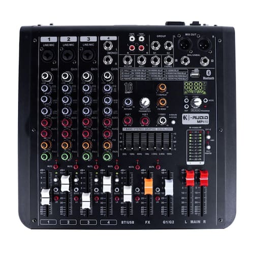 Mesa k-audio mp410 4 canais Especificações técnicas: - mixer analógicos de alto desempenho com efeitos integrados; - equalizador paramétrico de 3 bandas low - grave 100hz / mid - médios / 1khz / high - agudo 10khz ; - ajuste do pré amplix1fcador por canal gain ; - 2 saídas trs aux send ; - 1 saída dedicada para máquina de efeito por canal; - máquina de efeitos composto por 16 preset e ajustes; - controle de pan por canal left / right ; - mute e controle de volume por fader de 60mm; - 48v power ; - botão de acionamento do 48v divididos por grupo; - entradas tipo rca com controle de volume por fader 60mm; - 2 buses de grupo saídas tipo rca para gravação; - equalizador gráx1fco de 7 bandas para ajuste da saída master ou subgrupos; - saída xlr main out; - saída trs main out; - vu saída meterbridge standard ; - saída trs dedicada ao uso de fones de ouvido; - porta usb 2.0 para conexão de pendrive com áudios em mp3; - conexão bluetooth para reprodução através de equipamento portátil Homologação Anatel: 007892012769 Marca: Não Informado