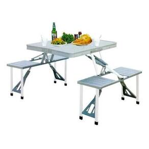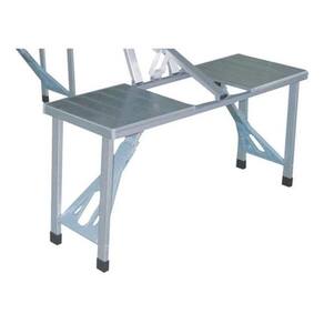 ESPECIFICAÇÕES Marca: NTK Material: Estrutura e bancos de alumínio e tampa de MDF aluminizado Medidas aberta: 85,5cm comp. x 67,5cm larg. x 67cm alt. Peso: 9,2kg Peso suportado da mesa: 30kg Peso suportado nos bancos: 85kg cada Ean: 7894149709572