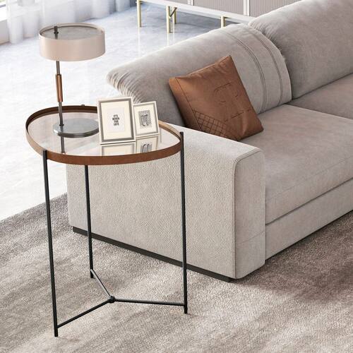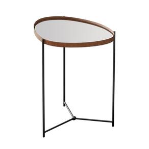A mesa lateral orgânica Alamanda contém a borda em couro sintético e espelho 4mm, além dos pés em ferro.