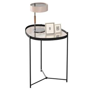 A mesa lateral orgânica Alamanda contém a borda em couro sintético e espelho 4mm, além dos pés em ferro.