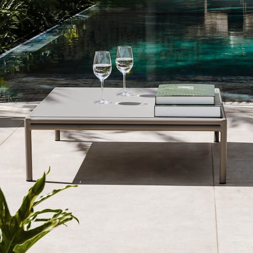 Os tecidos são especialmente selecionados para suportar a exposição solar, mantendo as cores vibrantes e resistentes ao desbotamento. E, para maior praticidade, todas as almofadas são removíveis, pois, apesar do enchimento em espuma de alto desempenho, não devem ser expostas à chuva.