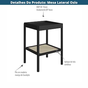 A Mesa Lateral Oslo é confeccionada em MDP com acabamento BP, pés de madeira maciça e aplique de tela sintética na prateleira inferior, assume um papel importante na decoração, além de ser um móvel de apoio, é funcional e aberta a muitas possibilidades na hora de decorar. Traz como característica um traço artesanal, suave e acolhedor. Com design escandinavo minimalista, remete em suas linhas retas a simplicidade, charme e funcionalidade que sua casa merece. Composta com uma paleta de cores neutras, onde refletem as paisagens nas quais a linha foi inspirada, tornando-se assim a opção ideal para um ambiente com toque sofisticado e ao mesmo tempo aconchegante.