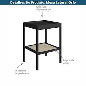 Produto: Mesa Lateral de Apoio Oslo Artesano 43 cm (largura) MDP Nero Palha Sintética Bege Pé Madeira Maciça | Cor: Preto, Bege | Materiais: MDP, Madeira Maciça, PVC com Poliéster | Tonalidade: Preto | Estilo de Decoração: Escadinavo | Cômodo Indicado: Salas | Linha: Oslo | Montagem: Desmontado | Marca: Artesano | Peso Suportado (kg): | Área de Uso: Interna | Garantia (tempo): 6 meses | Garantia (descritivo): Garantia contra de fabricação de 06 meses. Consulte as nossas políticas. | Peso (kg): | Medidas: Profundidade (cm): | Medidas: Altura (cm): | Entregue Montado?: Não | Largura (cm): 43 | Possui Manual de Montagem?: Acompanha o Produto | Origem do Produto: | Conservação e Manutenção: Limpeza com pano úmido em solução de água e detergente neutro. Secar em seguida. | Acabamento: Fosco | Atributos: Elegante, Durável, Rústico, Resistente | Material Da Estrutura: Madeira | Madeira Sustentável?: Sim | Estado de Origem: RS | Contéudo Da Embalagem: 01 Mesa Lateral | Formato: Quadrado | Inclui manual de montagem: Sim | Requer montagem: Sim | Profundidade: 40 | Material: MDP | Fabricante: Artesano | Altura: 58