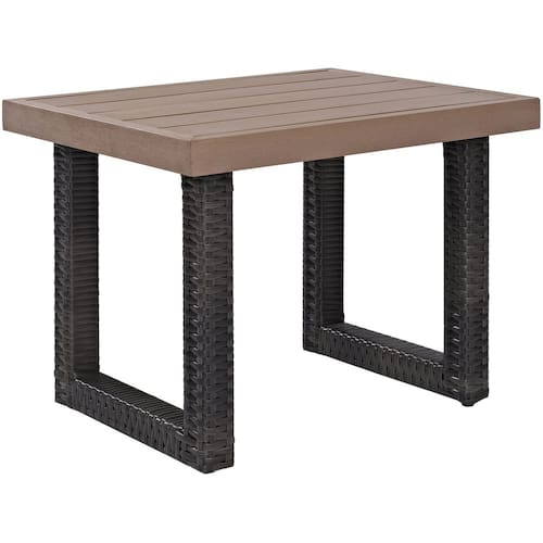 - MÓVEIS TRADICIONAIS DE PATIO: Com vime de resina marrom multitom tecido à mão nas pernas e a mesa de ripas de madeira poli marrom claro, esta mesa lateral externa cria um visual atemporal que complementa qualquer ambiente ao ar livre.