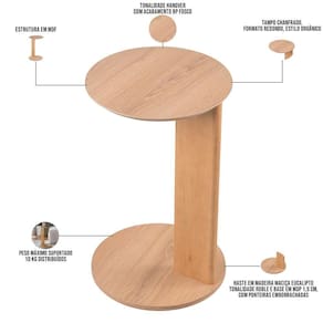 O tampo em MDF, com seu design clean e contemporâneo, é perfeito para apoiar bebidas, livros ou pequenos objetos decorativos, tornando seu espaço ainda mais alegre e prático. O suporte em madeira maciça de eucalipto garante não só estabilidade, mas também um calor visual que faz toda a diferença na decoração. Já o formato redondo da base e a estrutura robusta são sinônimos de sofisticação discreta, permitindo que a mesa se integre harmoniosamente a diversos estilos de interiores. É uma adição versátil e charmosa, ideal para aqueles momentos de lazer onde um café à mão é sempre bem-vindo.
