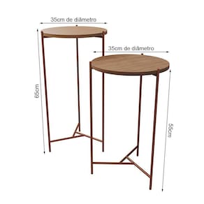 Mesa Lateral Redonda Áquila Cobre E Tampo ImbuiaJogo de mesa lateral, design sofisticado e moderno, o estilo permite que você tenha total liberdade para deixar seu ambiente ainda mais elegante, tem um visual único e traz junto com elas variações de cores dando uma combinação perfeita para seu ambiente.Tipo: Mesa LateralModelo: ÁquilaCor: Cobre Tampo: Imbuia Medidas:Mesa 01Altura: 55cmDiâmetro: 35cmMesa 02Altura: 55cmDiâmetro: 35cmATENÇÃOIMAGENS MERAMENTE ILUSTRATIVAS REALIZADO EDIÇÃO, PODENDO HAVER UMA PEQUENA VARIAÇÃO DE COR DEPENDENDO DE CADA TELA OU MONITOR. Mesa Lateral Redonda Ãquila Cobre e Tampo Imbuia