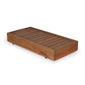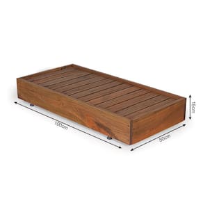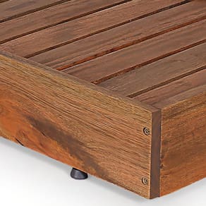 É construída em madeira maciça de eucalipto, e o acabamento é feito com STAIN na tonalidade Nogueira. Esse tipo de acabamento não forma filme, permitindo que a madeira trabalhe de acordo com as condições climáticas, além de possuir proteção UV e hidrorepelente.