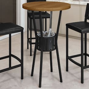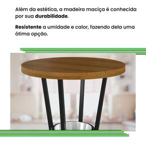 A mesa bistrô destaca-se pelo tampo redondo de madeira maciça, que realça os veios naturais e a textura única da madeira. A base de aço robusta traz um toque moderno e elegante, complementada por detalhes em