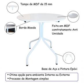 Características: Tampo de madeira em MDF 15mm Base em aço com pintura epóxi Compacta Leve Resistente e durável Pode ficar exposta ao sol Feita em madeira com tratamento anti umidade Fica bem em ambientes internos e externos Praticidade na limpeza e manutenção Processo de montagem simples