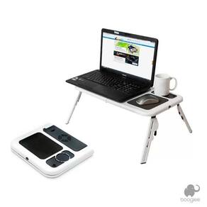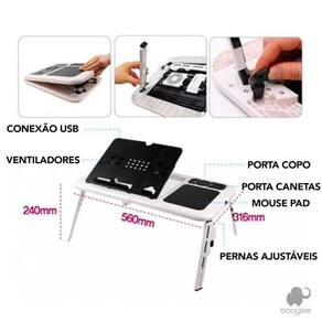 Mesa Notebook Com 2 Coolers Usb DobrávelMesa super prática de usar. Por ser dobrável, você pode carregar para qualquer lugar, dentro da sua bolsa ou mochila. E ideal para aquelas pessoas que gostam de usar o laptop enquanto estao sentadas no sofá, ou deitadas na cama. Enquanto você utiliza seu laptop, pode tomar um suco, fazer suas anotações, o que pode ser muito util para quem precisa estudar ou fazer algum trabalho. Características: - 2 Coolers - Regulagens de Altura e Inclinacao - Mouse pad - Porta Copos e Porta Caneta - Compativel com Notebook de Ate 15,4 Informacoes Tecnicas: - Material Composto de Plastico Extra Resistente - Dimensoes Aproximadas do Produto Aberto: 56 x 31 cm - Dimensoes Aproximadas do Produto Dobrado: 28,5 x 31,5 x 3,6 cm - Peso Aproximado: 1,5 kg Imagens meramente ilustrativas. Laptop e elementos decorativos não acompanham o produto.