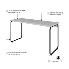 Sobre o ProdutoMesa Office 135x60x75cm Round ROME135 çoDescrição do Produto:A Mesa Round ROME6135 possui tampo engrossurado de 30mm, finalizado com fitas dede borda em PVC, que garante maior durabilidade e resistência. Sua estrutura é feita em tubos de aço robustos, proporcionando estabilidade e um design industrial contemporâneo. Combinando funcionalidade e estilo, esta mesa é ideal para ambientes modernos de trabalho ou estudo, unindo praticidade e elegâ Linha Round combina estilo contemporâneo e industrial, oferecendo móveis funcionais e modernos. Os tampos em MDP Perffect com bordas em PVC garantem durabilidade, enquanto as estruturas em tubos de aço redondos com pintura epóxi proporcionam robustez e resistência. Com um design limpo, as peças são ideais para ambientes modernos, unindo praticidade e elegância em qualquer espaço de trabalho ou Inclusos:1 MesaDimensões dos Produtos:Mesa Office 135x60x75cm Round ROME135 ço: 135 x 60 x 75 cmInformações Logísticas (Comp. X Prof. X Alt.) 140 x 64,5 x 7 cm - Peso: 15,26 KgPeso Total: 15,26 KgObservações:Não acompanha acessórios decorativos. Imagens meramente ilustrativas.Informações Técnicas / Características:- Cor do Produto: ço- Cor do Predominante: Revestido- Marca: Compace- Modelo: ROME135- Linha: Round- Material: Mdp- Material da Estrutura / Pés: Aço- Acabamento: Perffect Acetinado- Escala de Brilho: Fosco- Fita de Borda: Pvc - Possui Gavetas: Não - Possui Pés: 2- Pés Niveladores: Sim - Acabamento Estrutura: Epóxi-Pó- Formato: Retangular - Suporta Até (kg): 40kg- Comprimento: 135cm- Profundidade: 60cm- Altura: 75cm - Peso Lí.: 14,37Kg- Recomendações Manutenção e Limpeza: Para a limpeza, utilize flanela seca ou pano macio levemente umedecido em água. - Necessita de Montagem: Sim / Acompanha Manual de Montagem- Complexidade da Montagem: Média - Garantia: 6 meses