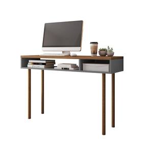 com 02 divisões para acomodar objetos, e os pés em madeira marroml maciça deixando o produto mais moderno e sofisticado. Móvel pode ser utilizado como multifunção e multiambiente se adequando a sua necessidade. Seu design moderno oferece um charme especial em sua decoração! Produto Montado: Sim Acabamento da Prateleira: BP Melamínico Acabamento dos Pés: Verniz Altura dos Pés: 50 Ambiente Principal: Escritório codigo_ean: 7909903222355 Complexidade da Montagem: Média: pode ser montado por mais de uma pessoa e/ou necessite de maior conhecimento para montagem Cor: Cinza/Nogueira Caiena Cor do Produto: Cinza/Nogueira Caiena Escala de Brilho: Fosco Escala de Brilho da Prateleira: Fosco Espessura do Tampo: 15 mm Formato: Retangular Itens Inclusos: 1 Mesa, Kit Ferragens e Manual de Montagem Manual de Montagem e Instalação: https://product-hub-prd.madeiramadeira.com.br/820225/documents/12f1030c-4d72-4378-a220-e76f87a4e80d48c3b8c2555a147e8a29820224.pdf Material da Prateleira: MDP Material Principal: MDP Montagem Flex: Não, só é possível a montagem do produto conforme imagem do anúncio. Necessita Montagem: Sim Origem do Produto: Nacional Pés Reguláveis: Não Peso: 17,14 kg Peso Máximo por Prateleira: 5 kg Possui Passa Cabos: Não Possui Pés: 04 Possui Porta Objetos: Não Possui Portas: Não Possui Suporte para Teclado: Não Recomendações de Uso, Manutenção e Limpeza: Limpar com pano macio, levemente umedecido e em seguida, pano macio seco. Não utilizar produtos abrasivos e/ou a base de solventes. Sapatas Niveladoras: Não Sistema de Montagem: Utiliza-se na montagem do produto sistema de fixação minifix, dobradiças, dispositivos angulares, cavilhas, parafusos, porcas cilindricas, entreOutros; Suporta Até (kg): 5 kg Ean: 7909903222355