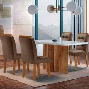 Com espaco ideal para dispor as melhores receitas e recepcionar a sua familia, a sala de jantar Olimpia com cadeiras Carol e um movel completo em todos os sentidos. O conjunto e compacto, possui sua estrutura em MDF e acabamento em pintura UV, que proporcionam melhor durabilidade ao produto. As cadeiras tem um designer sofisticado, misturando o moderno e o classico com seu encosto em detalhes de botoes, trazendo conforto e elegancia para seu lar. Possui puxador na parte superior do encosto para facilitar a movimentacao e evitar o toque ao tecido. Caracteristicas: Contem vidro Tampo canto curvo Estrutura em MDF Acabamento em Pintura UV Dimensoes Mesa: Altura: 80 cm Largura: 120 cm Profundidade: 80 cm Dimensoes Cadeira: Altura: 102,5 cm Largura: 42 cm Profundidade: 56 cm Garantia do Fornecedor 3 meses Informacoes importantes : As tonalidades das cores podem sofrer alteracao de acordo com a configuracao de cada monitor. Os objetos que ambientam as fotos nao acompanham o produto. Nao disponibilizamos a montagem do produto. O produto acompanha manual de montagem. Nao nos responsabilizamos por danos no produto causados por montagem de qualquer outra forma que nao seja a descrita no manual. Verifique as dimensoes do produto e certifique-se que o percurso que ele fara ate o local de uso permite sua passagem. Moderna Mobilia reserva o direito de alterar as especificacoes tecnicas sem previo aviso. As medidas contidas no site podem sofrer variacoes de acordo com a montagem, tipo de costura etc.