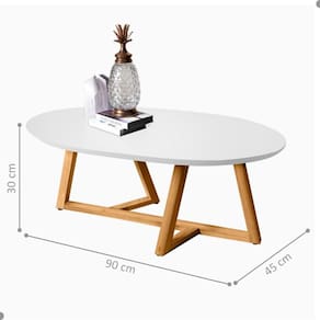 Feito em MDP/MDF. Pés em madeira maciça e formato oval.